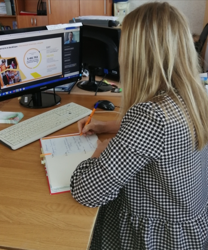 10 сентября: Всероссийский вебинар "Развитие добровольческого движения" Специалист по социальной работе отделения социальной помощи и срочных социальных услуг, один из руководителей волонтёрского отряда "Доброе дело", Прохорцева Ирина приняла участие во Всероссийском вебинаре по теме развития добровольческого движения и проведения основных добровольческих мероприятий до конца 2020 года. На вебинаре подвели итоги общероссийской акции взаимопомощи #МыВместе, промежуточные итоги всероссийских конкурсов, рассмотрели вопросы совершенствования нормативно-правовых актов по направлениям добровольческого движения. Эксперты рассказали о реализуемых образовательных программах по направлениям добровольчества.