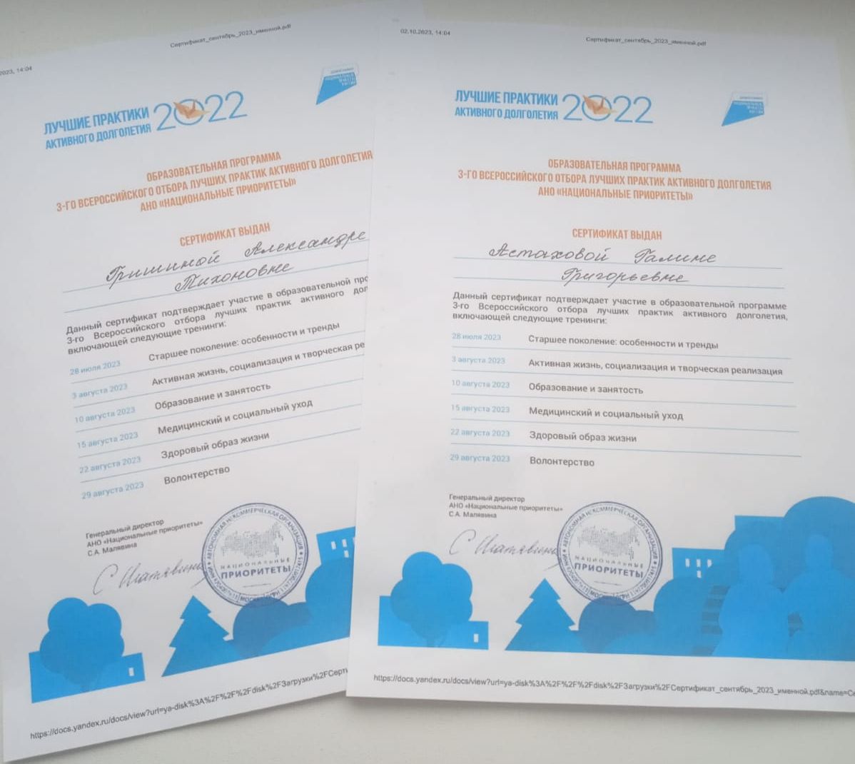 С 28 июля по 29 августа состоялась бесплатная образовательная онлайн-программа, посвященная особенностям работы с людьми старшего возраста, а также организации и тиражированию практик активного долголетия. В программе приняли участие специалисты отделения социальной реабилитации и активного долголетия Комплексного центра социального обслуживания населения Болховского района Гришина А.Т. и Астахова Г.Г.
