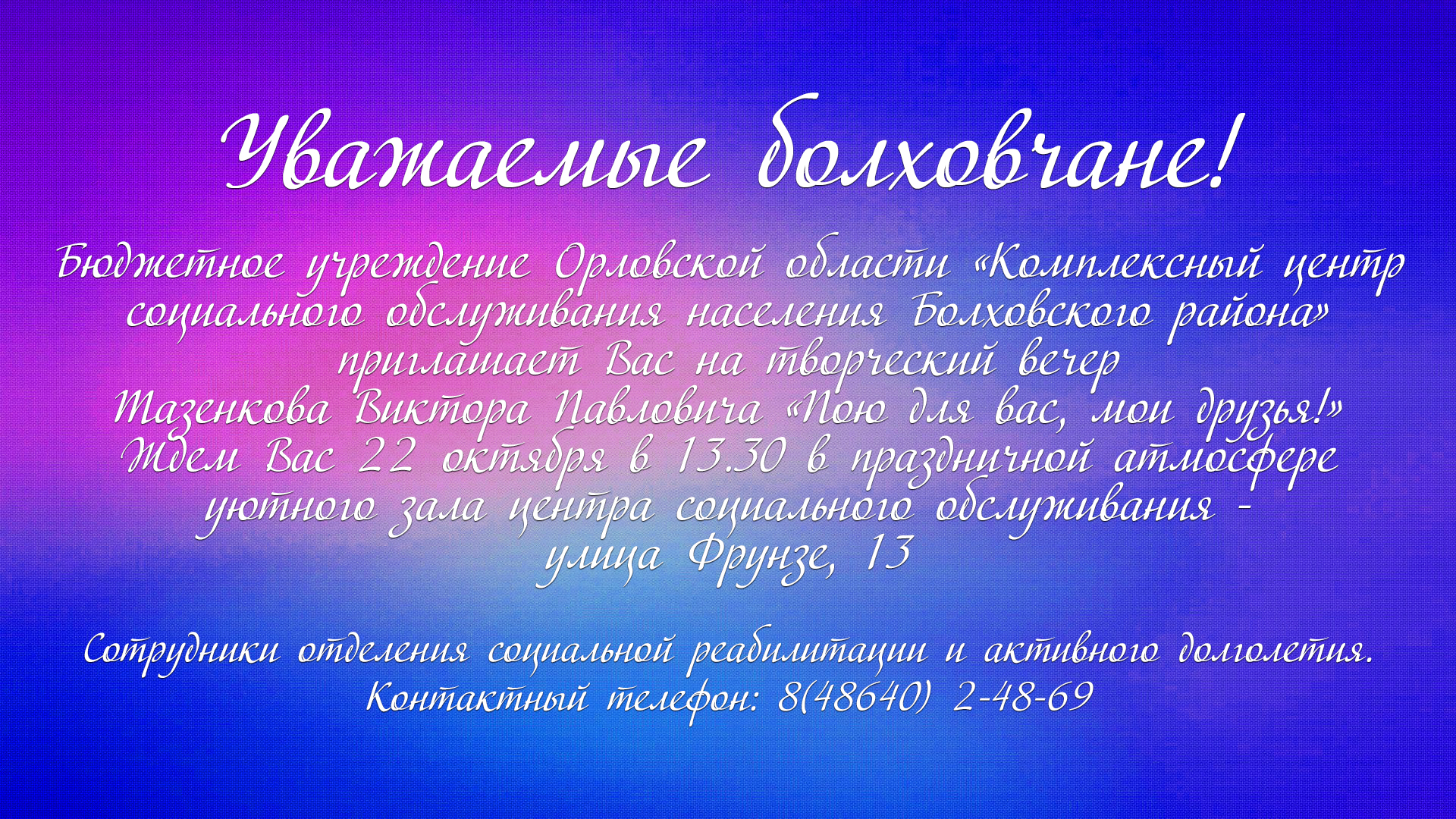КОМПЛЕКСНЫЙ ЦЕНТР СОЦИАЛЬНОГО ОБСЛУЖИВАНИЯ НАСЕЛЕНИЯ БОЛХОВСКОГО РАЙОНА