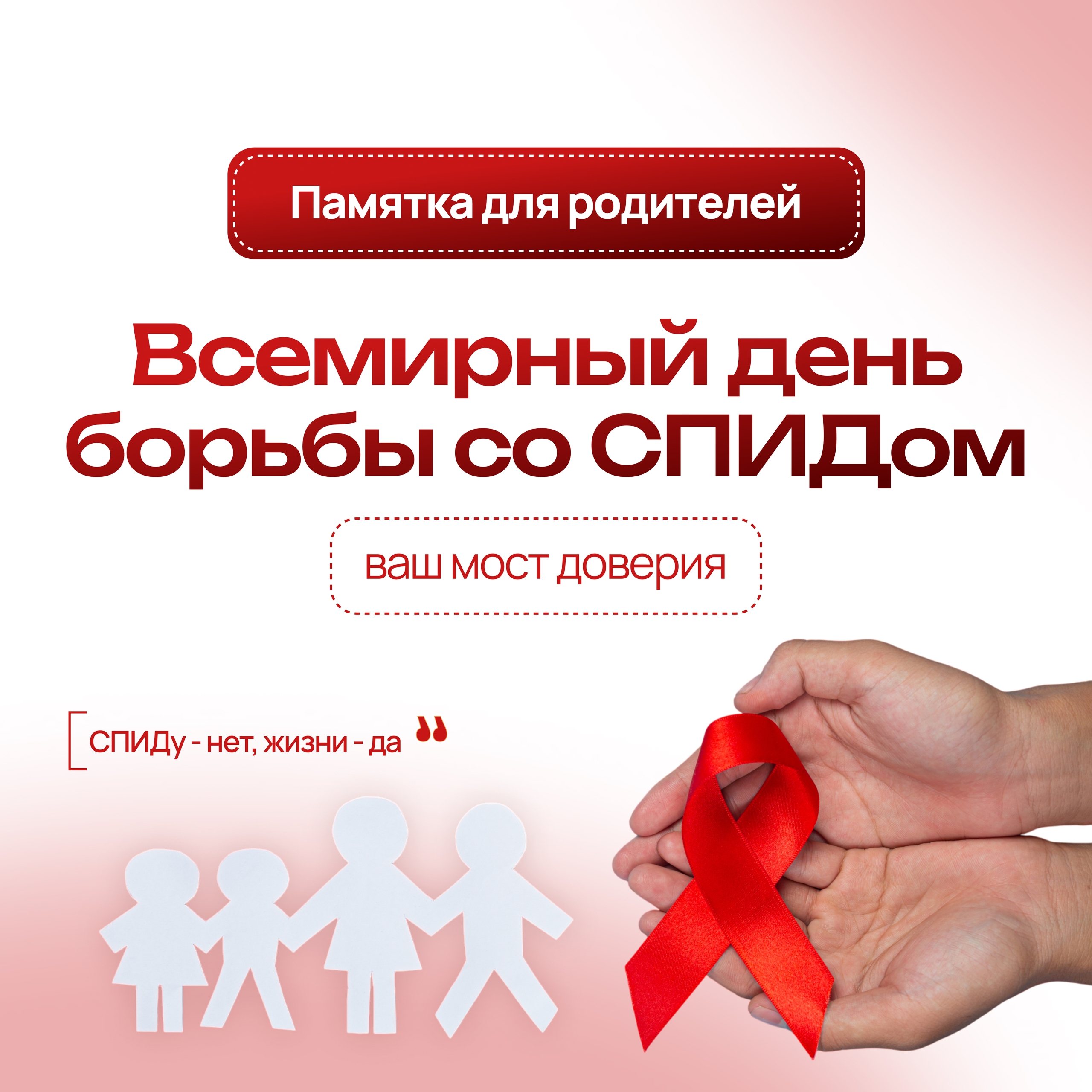 1 декабря 2025 года Служба экстренного реагирования «SOS-консультанты» отделения профилактики безнадзорности несовершеннолетних» распространила памятку для родителей через мессенджеры WhatsApp,Telegram,MAX. Предупреждение распространения ВИЧ-инфекции продолжает оставаться одной из важнейших задач здравоохранения Российской Федерации, что закреплено в Государственной стратегии противодействия распространению ВИЧ-инфекции в Российской Федерации на период до 2030 года.