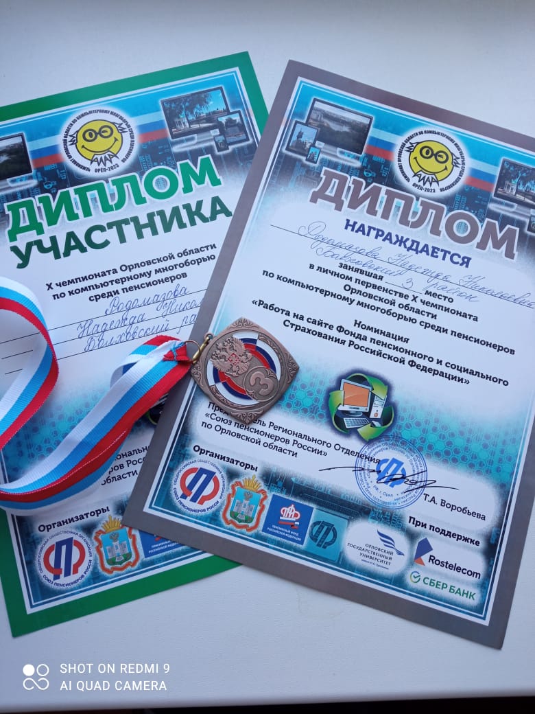 25.05. 2023 г. в Орле в очном формате состоялся X чемпионат Орловской области по компьютерному многоборью среди пенсионеров. Мероприятие проходило в здании Орловского государственного университета им. И.С. Тургенева и собрало участников из 23 районов области. Участники турнира боролись за награды в личном первенстве, а также за командное место. В чемпионате приняли участие пенсионеры Болховского района: Гуляев Павел Алексеевич и Родомазова Надежда Николаевна. Надежда Николаевна награждена ценным подарком, дипломами и медалью за 3 место в личном первенстве в номинации «Работа на сайте Фонда пенсионного и социального Страхования Российской Федерации». Павел Алексеевич награждён ценным подарком, дипломами и медалью за 2 место среди мужчин в абсолютном первенстве X чемпионата Орловской области.