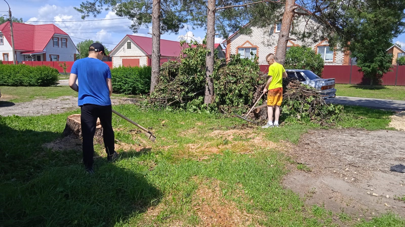 Специалисты Семейного МФЦ и участники волонтерского отряда навестили доброго друга, навели порядок на придомовой территории и приусадебном участке: убрали ветки, оставшиеся после спила дерева, сухую траву, очистили от сорняков грядки и теплицу.