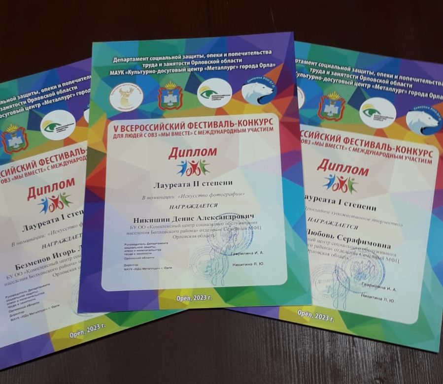 Клиенты БУОО «КЦСОН Болховского района» в феврале-марте приняли участие в V Всероссийском фестивале-конкурсе для людей с ограниченными возможностями здоровья «Мы вместе!» с международным участием. Традиционно он проходил в «Культурно-досуговом центре «Металлург» города Орла. На конкурс поступило около 1600 заявок из 47 регионов России, а также из Белоруссии и Казахстана. 7 апреля были подведены итоги по номинациям: «Вокал», «Инструментальное исполнение», «Хореография», «Художественное чтение», «Прикладное художественное творчество», «Изобразительное искусство», «Искусство фотографии». Наконец-то мы получили долгожданные награды. Дипломы Лауреата I степени получили И. Л. Безменов, Л. С. Егорова. Дипломами лауреата II степени награждены Е. В. Иванова и Д. А. Никишин. Сотрудники отделения социальной реабилитации и активного долголетия отмечены благодарностью организаторов конкурса за высокую подготовку участников фестиваля, неоценимый вклад в развитие творческих способностей и сохранение культурных ценностей. Поздравляем всех участников!