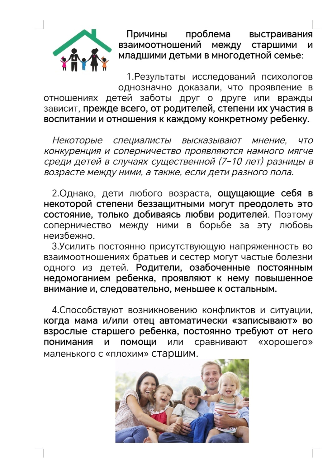 Самой распространенная проблема, которую приходится разрешать матерям и отцам, – это ревность старших к младшим (или наоборот), появление конфликтов, ссор и даже драк. Рекомендации для родителей, как выстраивать позитивные взаимоотношения между старшими и младшими детьми в семье: • говорить детям как можно больше теплых слов; • не забывать обнимать ребенка, прикасаться к нем;. • создавать ситуацию приятия всех членов семьи друг другом; также необходимо общаться с детьми персонально, обязательно гуляя по отдельности с каждым ребенком хотя бы раз в неделю, разговаривая о его делах, держа его за руку. всегда помнить, что старший ребенок – это не бесплатная нянька для младшего и не домработница.