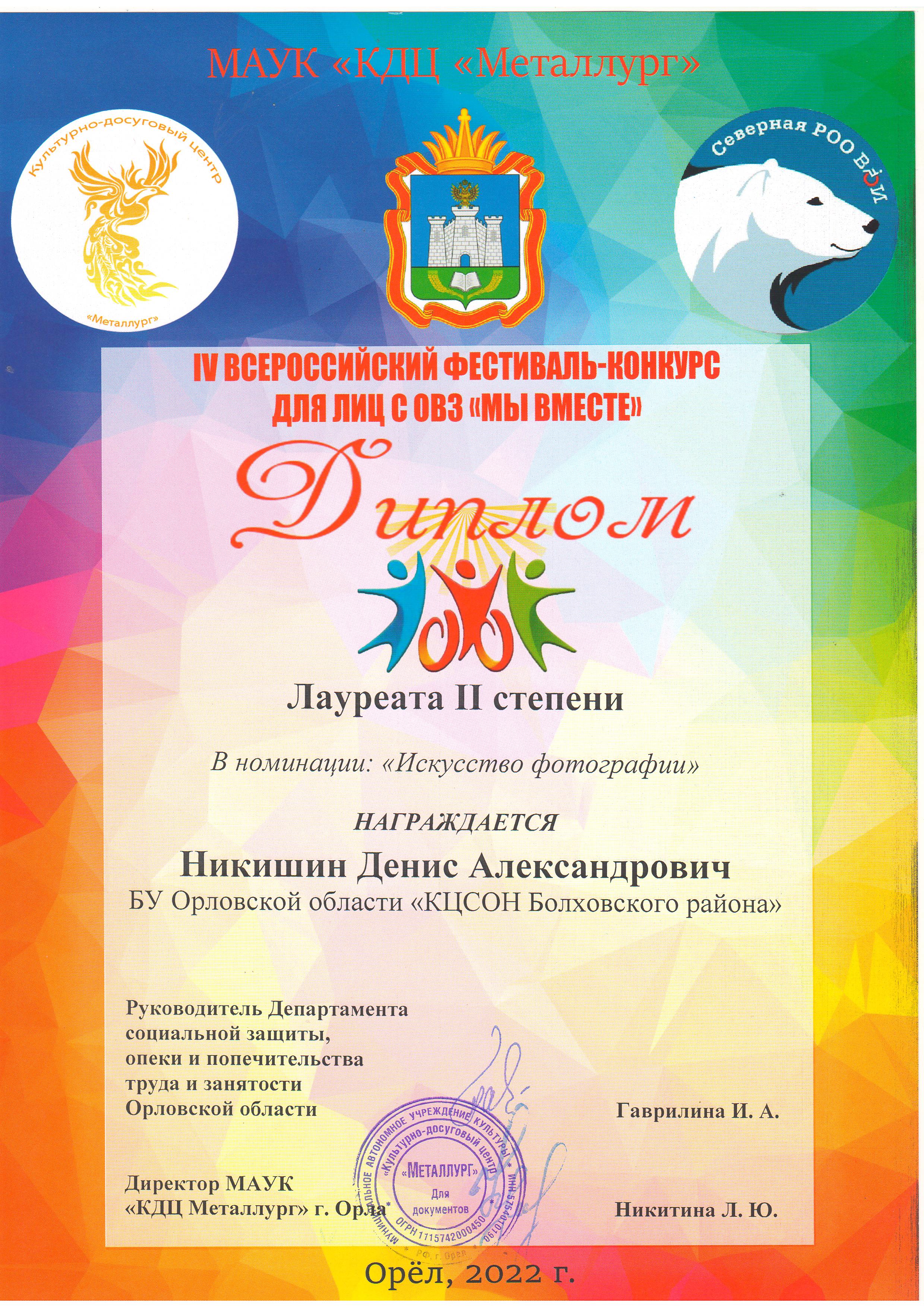 15 апреля 2022 года в концертном зале культурно-досугового Центра "Металлург" г. Орла состоялось награждение и гала-концерт победителей IV Всероссийского фестиваля - конкурса для людей с ограниченными возможностями здоровья «Мы вместе!».
