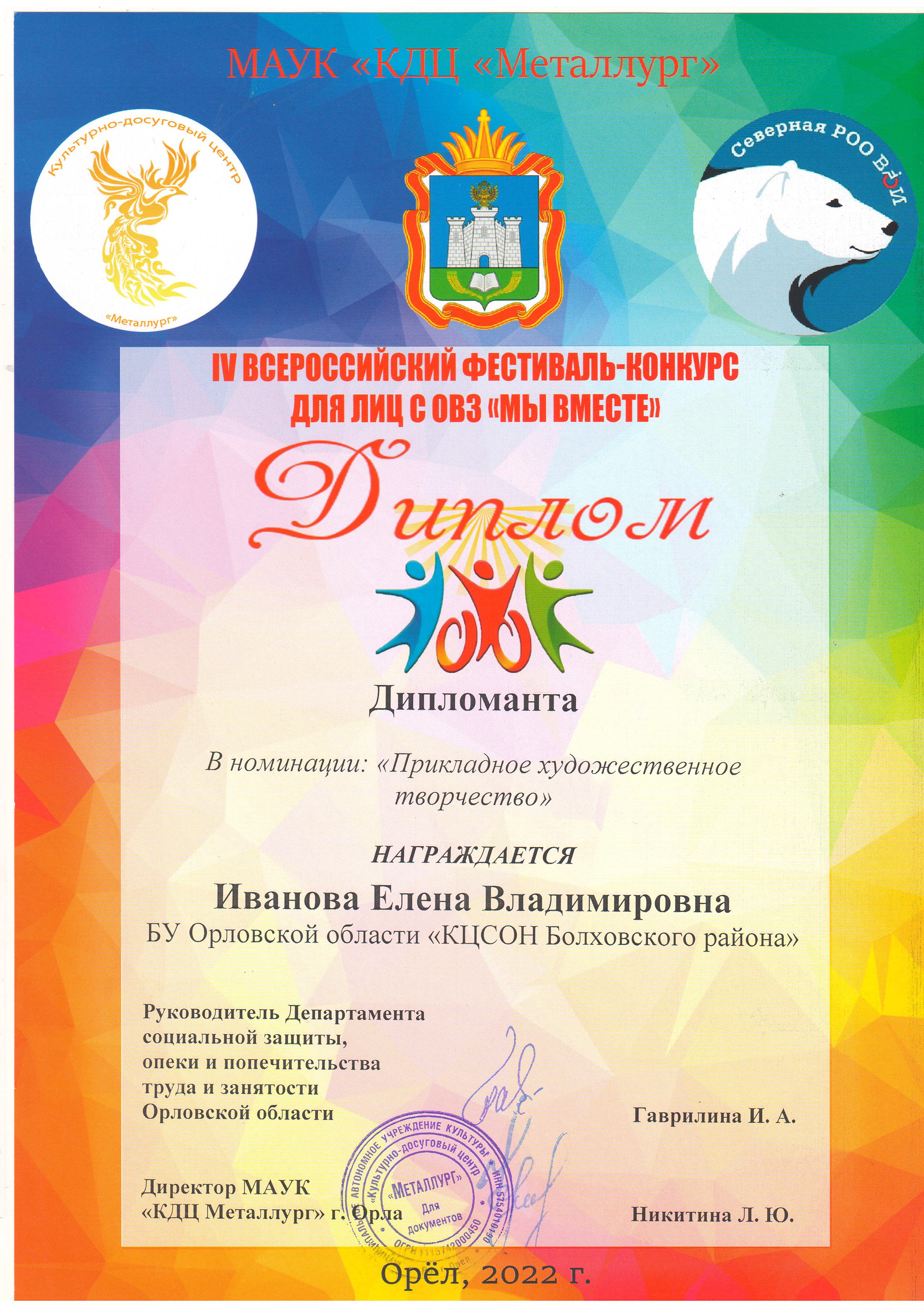 Клиенты отделения БУ ОО «КЦСОН Болховского района» социальной реабилитации и активного долголетия Иванова Елена Владимировна, Никишин Денис Александрович - ежегодные участники этого конкурса. В этом году Елена - дипломант в номинации «Декоративно-прикладное художественное творчество».