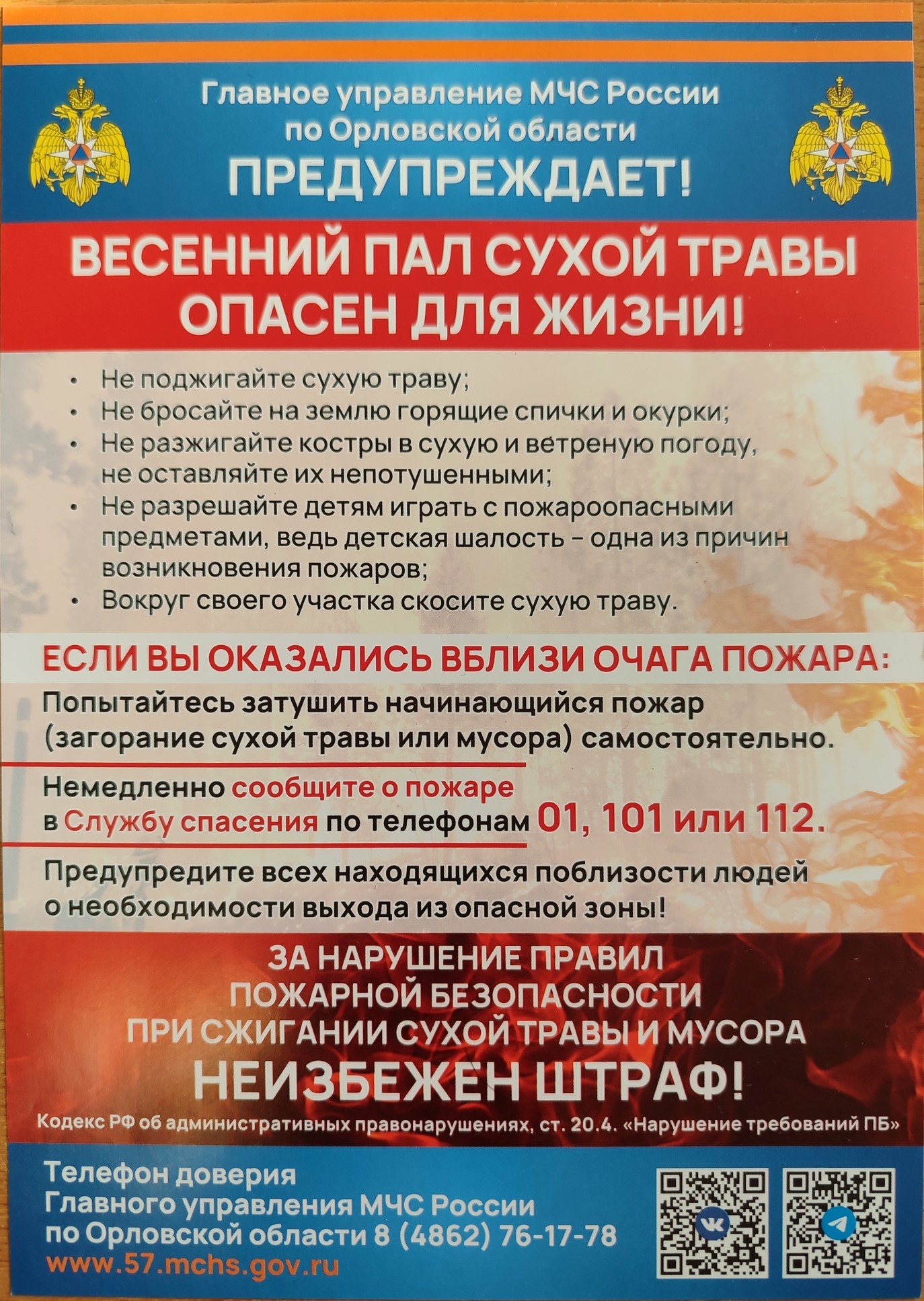 Ежедневно пожарные и инспекторы Государственного пожарного надзора Главного управления МЧС России по Орловской области сталкиваются с теми, кто пренебрегает мерами безопасности и недооценивает опасность свих действий, связанных со сжиганием сухой травы и мусора. Виновники привлекаются к административной ответственности. Каждый год весной все вокруг окутывается едким дымом. С приходом тепла сотрудники МЧС России сталкиваются с одной и той же проблемой – палами сухой травы. В условиях ясной, сухой и ветреной погоды горение травы и мусора представляет наибольшую опасность, так как эти пожары быстро распространяются и угрожают лесным массивам, дачным обществам жилым постройкам. Причина – безответственное отношение к содержанию своего имущества, территорий и нарушение правил пожарной безопасности. Для их тушения требуются усилия десятков людей, влекущие большие материальные затраты. Количество выездов пожарных подразделений на подобные загорания достигает максимальных значений – до двухсот в сутки. Практически все травяные палы происходят по вине человека. Инспекторами подразделений надзорной деятельности и профилактической работы проводятся расследования по всем фактам сжигания сухой растительности и мусора с нарушением требований пожарной безопасности. В настоящее время за сжигание сухой растительности составлено более 30 протоколов об административных правонарушениях, цифра ежедневно меняется. В 2024 году было составлено 673 протокола, из которых на граждан - 282 штрафа на сумму около 2 млн. рублей, 383 предупреждения, на должностных лиц – 6 штрафов и 1 предупреждение, на юридическое лицо – 1 штраф. В соответствии с Правилами противопожарного режима в Российской Федерации необходимо знать следующее: При использовании открытого огня для сжигания сухой травы, веток, листвы и другой горючей растительности на индивидуальных земельных участках населенных пунктов, а также на садовых или огородных земельных участках место использования открытого огня должно располагаться на расстоянии не менее 15 метров до зданий, сооружений и иных построек. При использовании для этих целей металлической емкости или емкости из негорючих материалов, которые исключают распространение пламени и выпадение горючих материалов за пределы очага горения, расстояние может быть уменьшено вдвое (7,5 метра). При этом устройство противопожарной минерализованной полосы не требуется. Напоминаем, что Правила противопожарного режима в Российской Федерации обязательны для всех. За нарушение этих правил граждане и организации несут административную и уголовную ответственность. Не все граждане помнят и знают, что за нарушение требований пожарной безопасности предусмотрена ответственность. Так, штраф на гражданина составляет от 5 тыс. до 15 тыс. руб., на должностное лицо – от 20 тыс. до 30 тыс. руб., на лиц, осуществляющих предпринимательскую деятельность без образования юридического лица, – от 40 тыс. руб. до 60 тыс. руб., на юридических лиц – от 300 тыс. до 400 тыс. руб. Если нарушение выявлено в условиях особого противопожарного режима, сумма штрафов увеличивается и составляет соответственно от 10 тыс. до 20 тыс. руб., от 30 тыс. до 60 тыс. руб., от 60 тыс. до 80 тыс. руб. и от 400 тыс. до 800 тыс. руб. соответственно. Уголовная ответственность наступает в случае, если гражд