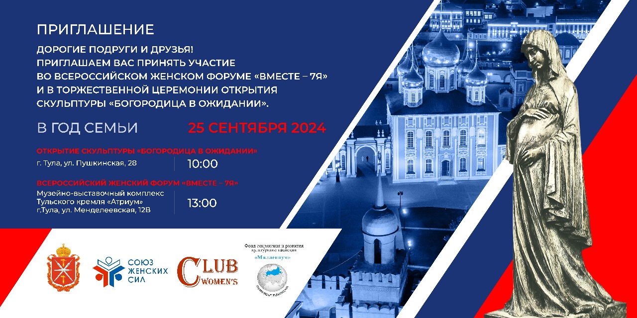 Внимание! 25 сентября в Туле состоится Всероссийский женский форум «Вместе-7Я» Форум посвящен консолидации женщин в целях решения проблем демографии, народосбережения, укрепления традиционных семейных ценностей, социальной и материальной поддержке семей, а также вопросам развития женского предпринимательства и семейного бизнеса. Деловая программа Форума включает стратегические и экспертные сессии, дискуссионные площадки, в том числе с лидерами общественного мнения, государственно-частные и бизнес-диалоги. Место проведения Форума: г. Тула, Менделеевская улица, 12 В, “Музейно-выставочный комплекс Тульского кремля”.Участие в Форуме бесплатное. Регистрация участников обязательна. Пройти регистрацию и узнать подробности программы мероприятия можно по ссылке: https://clck.ru/3AGGWp. Регистрация уже открыта и будет доступна до 25 сентября включительно. В рамках Форума планируется открытие первой в России скульптуры «Богородица в ожидании младенца Иисуса». | |